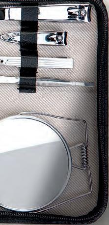 Indispensable zippered manmade-leather case contains comb, nail tools, mirror, lint brush, shaver, toothbrush, bottle opener. Lined; 5½x7".