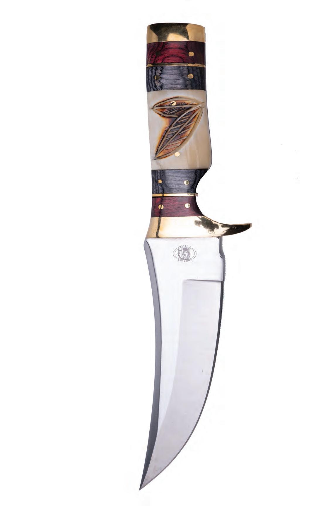 The handle is made from genuine natural bone, and features decorative wood spacers and a hand-carved motif of two overlapping feathers— a reminder for you to respect and connect with the natural world.