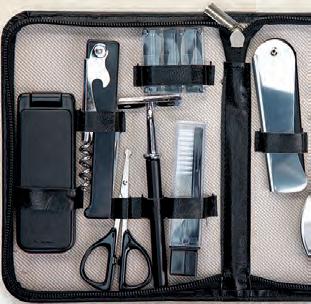Indispensable zippered manmade-leather case contains comb, nail tools, mirror, lint brush, shaver, toothbrush, bottle opener. Lined; 5½x7".