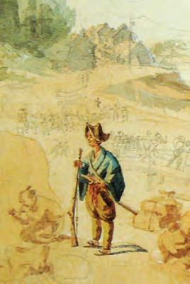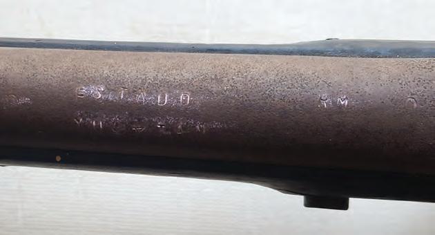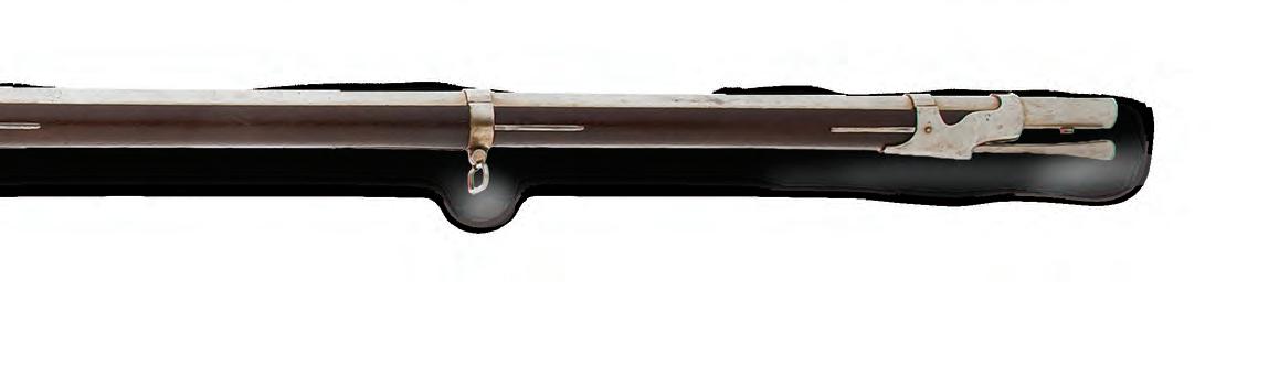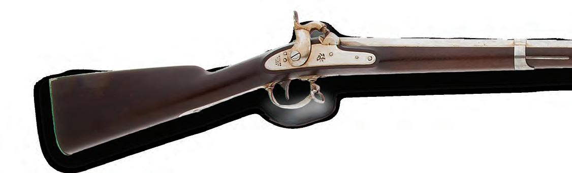 From 1871 to ’76 the Mexican government also purchased many Model 1842s. The one detailed on the opposite page was one of 600 sold to Mexico in the spring of 1875 and issued to various state militias. Its barrel features the signature speckled surface patina, while its walnut stock shows light splits caused