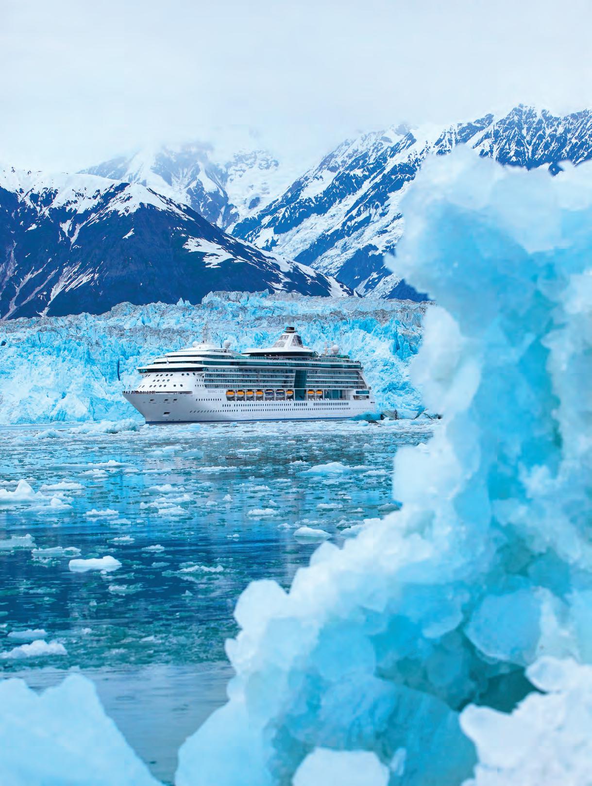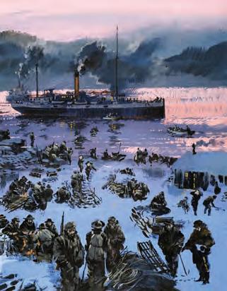 Mention of the Inside Passage—a stretch of North American Fjordland that wends its way northwest nearly 1,000 miles from Seattle through British Columbia, Canada, to Skagway, Alaska—evokes images of carefree days spent lolling aboard luxury cruise ships between ports of call. Such is the impression imparted in this photo by Michel Verdure of Royal Caribbean’s Radiance of the Seas lingering before the perpetually calving face of Hubbard Glacier. Around the turn of the 20th century, however, shipboard accommodations were anything but luxurious. In his painting Embarking for the Klondike Gold Rush (inset) the late British comic artist Graham Coton imagined the scene in 1897 when the first of the Klondike Gold Rush hopefuls arrived off Skagway aboard a screw steamer from Seattle and either waded or rowed a tender ashore to begin the grueling trek into the Yukon interior (see related feature, P. 30). Scarcely a third of them would make it.