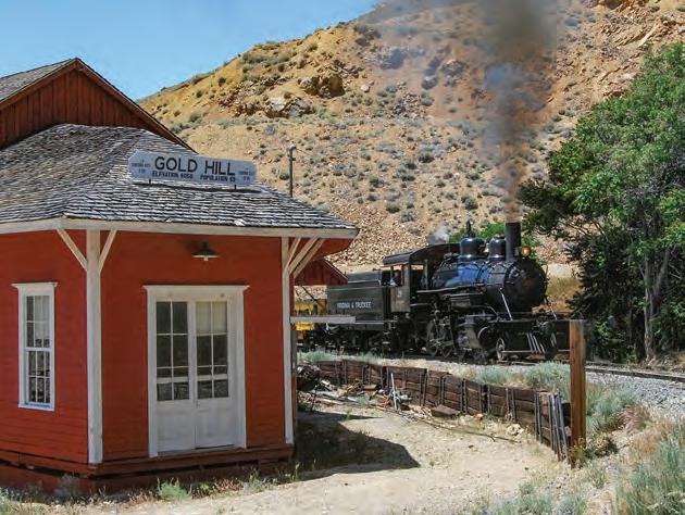 Far left: The 1880s headframe of the Yellow Jacket rises tomblike atop the site of the horrific 1869 fire that claimed several dozen men. Above: The Virginia & Truckee tourist train approaches the depot. At last count in 2005 Gold Hill’s population was 191.