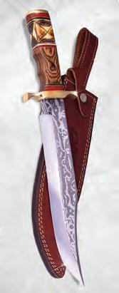 •Etched stainless steel full tang blade ; 16” overall • Painted natural bone and wood handle • Brass hand guards, spacers & end cap • Includes genuine tooled leather sheath