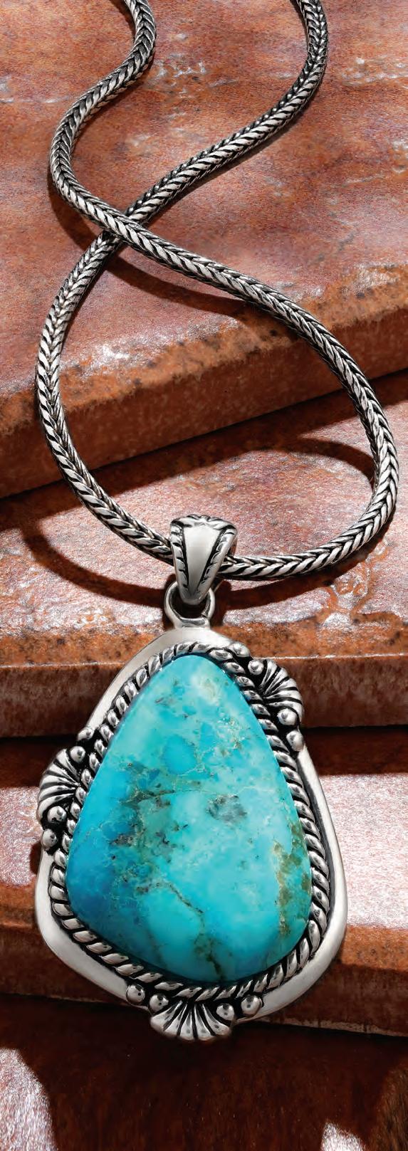 The turquoise center stone is surrounded by a raised twisted rope design along with impressive scrollwork accents. On either side of the turquoise stone, you’ll nd masterfully sculpted images of the majestic bison on a black ion-plated background also framed by a raised twisted rope border. Decorative Western-style art motifs honoring the American