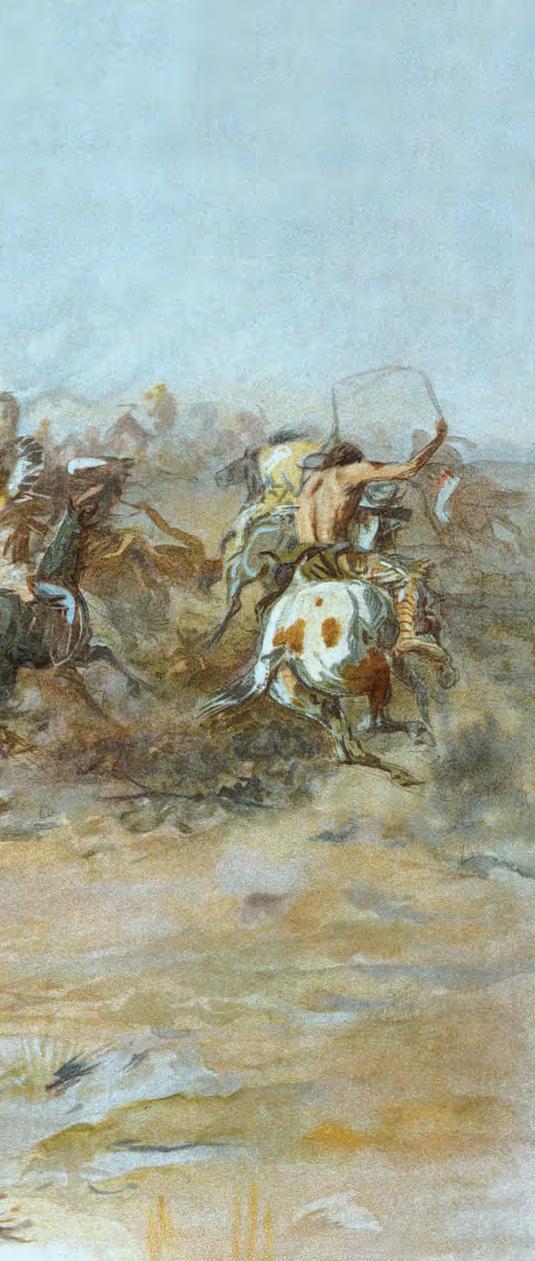 To fill the void of available information about White Swan’s life, Thomas chased down and interpreted the scout’s extensive artwork, which by the 1890s had provided “a safe and even productive refuge from the heartfelt perceived cultural losses.” White Swan’s works also won the praise of such prominent artists as Elbridge Ayer Burbank and Joseph Henry Sharp. “Using the biographic art form employed by Plains Indian warriors to proclaim their battle and hunting prowess,” Thomas notes, “he created at least 13 hide and muslin paintings and at least 24 drawings on paper depicting his and others’ deeds in battle.” The author’s detailed analysis confirms White Swan’s participation in such intertribal warfare as the battle with Lakotas at Shoulder Blade Creek near the Little Bighorn, probably in 1870. Of special interest to this reviewer is the Denver muslin about the Little Bighorn, which graphically records his having counted coup and been attacked by the Lakota Brave Bear.
