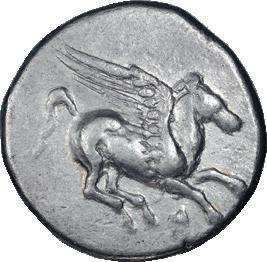 52. ILLYRIA, DYRRHACHIUM; 350-330 BC, Stater, 8.14g. Calciati-15. Obv: Pegasus flying r., Δ below. Rx: Helmeted head of Athena r., club and retrograde Σ behind, dolphin before. Exceptional image of Athena. Mint State / Near Mint State 1500