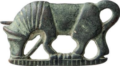 696. ROMAN BRONZE FIBULA, HORSE, ca. 2nd Century AD. Zoomorphic plate brooch of a grazing horse with striated details, snout held to the ground, tail curled high behind. L. 1 1/2” H. 3/4” (3.8 cm x 1.9 cm) 250