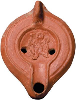 ROMAN NORTH AFRICAN TERRACOTTA OIL LAMP WITH EROS, ca. 300-450 AD. Ovoid shape with flat undecorated shoulder. Solid handle. Underside bear the potters initials, VR. On the discus, Eros running left holding an object in his right hand and looking behind him. Sooting around the wick hole. Ex Harlan J. Berk, Ltd. BBS 140, 27 October 2004. From the Mark Wieclaw Collection. L. 4 1/2” W. 3 3/8” (11.4 cm x 8.6 cm) 375