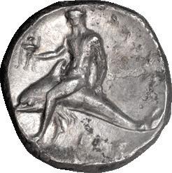 37. CALABRIA, TARENTUM; c. 325-281 BC, Stater, 7.79g. Vlasto-666. Obv: Naked horseman r., crowning horse, ΣΑ in l. field, APE/ΘΩΝ below. Rx: Taras on dolphin l., holding tripod; CΑΣ below. VF / aEF 650