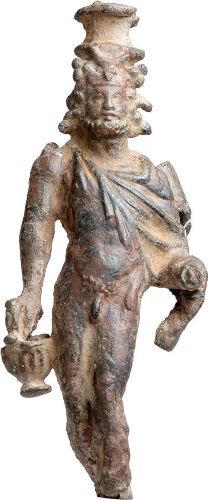 688. ROMAN BRONZE ZEUS EPIKARIOS, ca. 1st Century AD. Chief deity of Zela Pontus. The muscular god depicted nearly nude with mantle draped over one shoulder. He wears a modius headdress and sun disc, curled hair and beard framing his finely detailed face. Mounted. H. 4 3/8” (11.1 cm) 4500