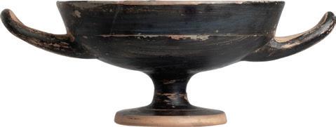 671. ROMAN OIL LAMP, ca. 2nd Century AD. Heavy globular body, large filling hole, separated from the rim by a wide sunken band. Flat topped tapering nozzle with rounded tip. Diagonally pierced lug on the left side of the body. Burn mark on the nozzle. From the Mark Wieclaw Collection. L. 3 5/8” W. 3” (9.2 cm x 7.6 cm). 250