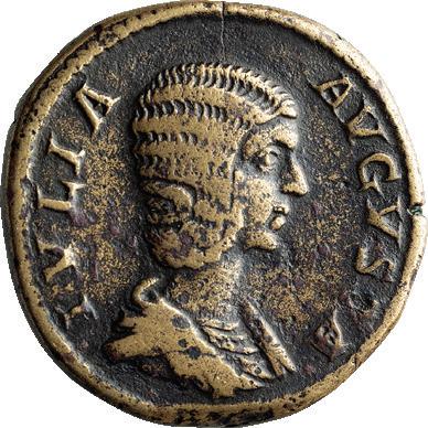 52. JULIA DOMNA; Rome, c. 206 AD, Denarius, 3.64g. Obv: IVLIA - AVGVSTA, Bust draped r. Rx: L - A - E - TITIA on l. and r., Laetitia standing l., holding wreath and rudder on globe. Ex Curtis L. Clay Collection. The standard catalogues, for example Hill-352, do not recognize that the mint of Rome struck LAETITIA denarii for Julia Domna on two separate occasions: first in 197-202 AD, the date deduced from the fact that Septimius’ new-style Syrian mint is known to have copied this reverse type from Rome; and second a much smaller issue that adds a globe below Laetitia’s rudder on the reverse, and shows on the obverse a later portrait of the empress, probably of c. 206 AD. The specimen offered in this lot is from the later and rarer second issue of c. 206 AD. VF 400