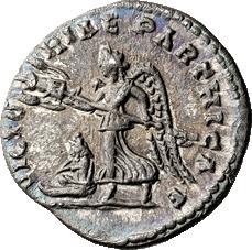 behind him, and holding bow before him with l. hand. Ex Curtis L. Clay Collection; acquired from J. Kern, June 1997. Scarce; only 3 specimens in Reka Devnia hoard. The second edition of BMC V wrongly assigns this type dated IMP VIII to the New Style Eastern mint only; but our specimen, and others in Rome (Gnecchi), Copenhagen, Oxford, and Budapest, all clearly show IMP VIII not VIIII and are in Roman style. Small flan. Near MS 125