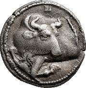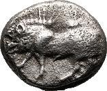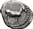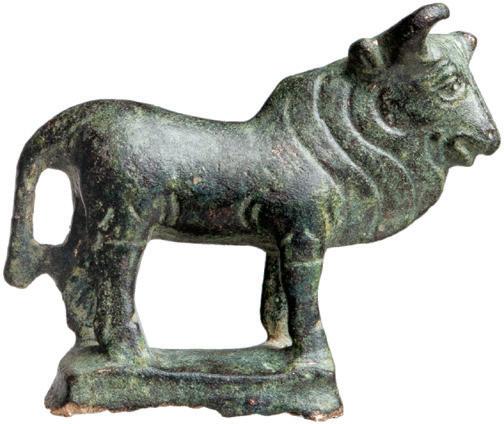 612. ROMAN BRONZE BULL, ca. 2nd-3rd Century AD. The bull modeled with defined musculature and facial detail, he stands foursquare on an integral plinth. L. 1 5/8” H. 1 1/2” (4 cm x 3.8 cm)
