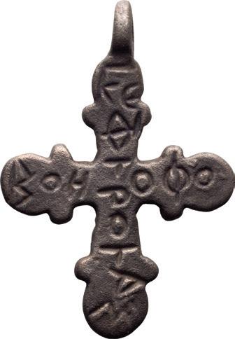 620. BYZANTINE SILVER CROSS PENDANT, ca. 9th-12th Century AD. A smaller pendant crafted in silver, inscribed on one side. Loop intact. L. 1 1/4” W. 3/4” (3.2 cm x 1.9 cm) 900