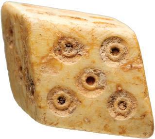 639. ROMAN BONE DIE, ca. 1st-3rd Century AD. This six-sided die is fashioned from bone, with each face meticulously incised to denote its numerical value. The markings consist of circular motifs, each comprising a prominent outer ring encircling a smaller central circle.