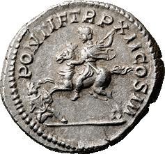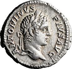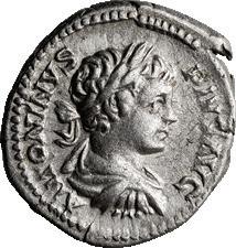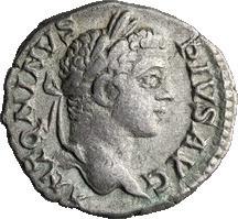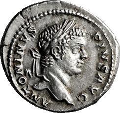 3. CARACALLA; 198-217 AD, Rome, 211-213 AD, Quinarius, 0.98g. King-p. 348, 5 (5 spec., including ours). Obv: ANTONINVS PIVS - AVG BRIT Head laureate r. Rx: COS III P P around, Victory advancing l., holding wreath and palm over shoulder. Ex Curtis L. Clay Collection; ex G. Hirsch 186, 10 May 1995, lot 1214. Only five specimens recorded by King, including ours. Small mark in upper hair. VF 450