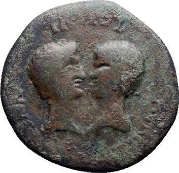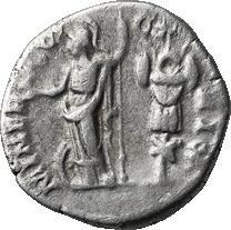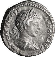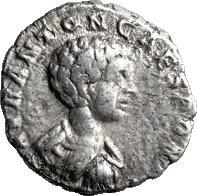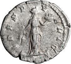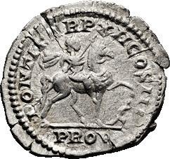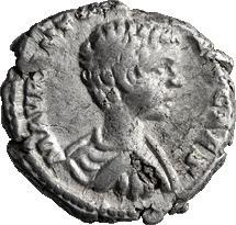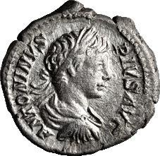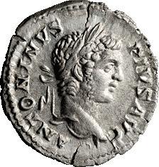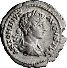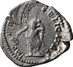 26. CARACALLA AS CAESAR; 195-198 AD, Rome, 197 AD, Denarius, 2.40g. Cf. BM-201, pl. 10.9. Obv: [M A]VR ANTON - CAE[S] PON[TIF] Bare-headed, draped bust r. Rx: IMP - ER[II] FELICITAS on l. and r., Felicitas standing l., holding short caduceus and child. Before Felicitas’ face, part of overstruck obverse legend, [CA] ES PON[TIF]. Ex Curtis L. Clay Collection; ex Lanz, eBay, 4 Nov. 2009. Apparently a flip strike, with parts of the obverse legend appearing on both the obverse and the reverse. aEF 200