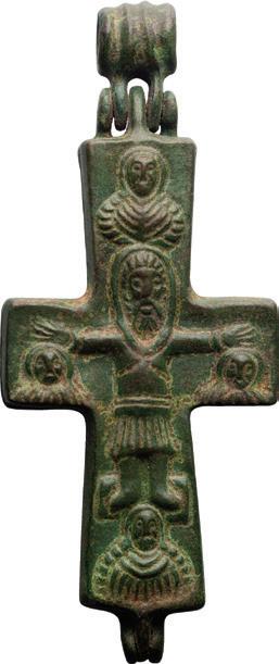 617. BYZANTINE BRONZE RELIQUARY CROSS HALF, ca. 9th-12th Century AD. Cruciform Christ Pantokrator facing. L. 4” (10.2 cm) 650