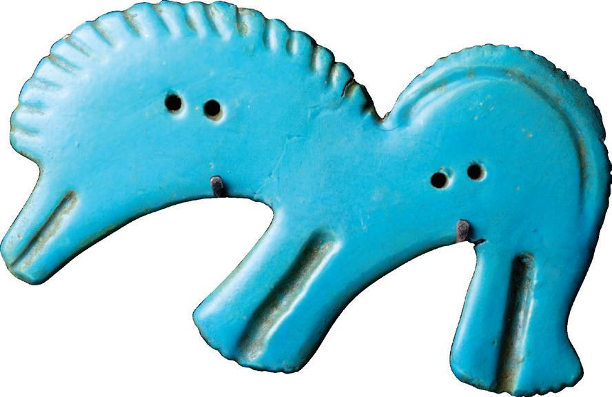 637. SCYTHIAN FAIENCE HORSE PLAQUE, ca. 9th-8th Century BC. Exceptional color. The plaque is highly stylized with notched details. Two pairs of attachment holes on the body.