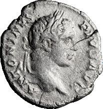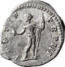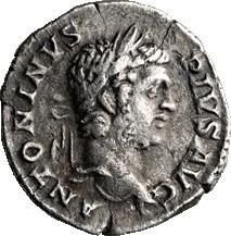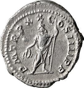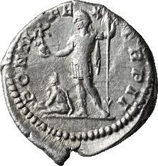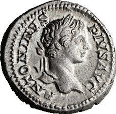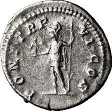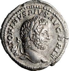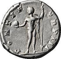 51. CARACALLA; 198-217 AD, Rome, early 201 AD, Denarius, 3.85g. Cf. BM-179, C-413, and RIC-30a. Obv: ANTONINVS - AVGVSTVS Bust laureate, draped, cuirassed r., seen from front. Rx: PONTIF - TR P III on l. and r., Caracalla standing r., head l., laureate, nude but for cloak over l. shoulder, holding globe and reversed spear.