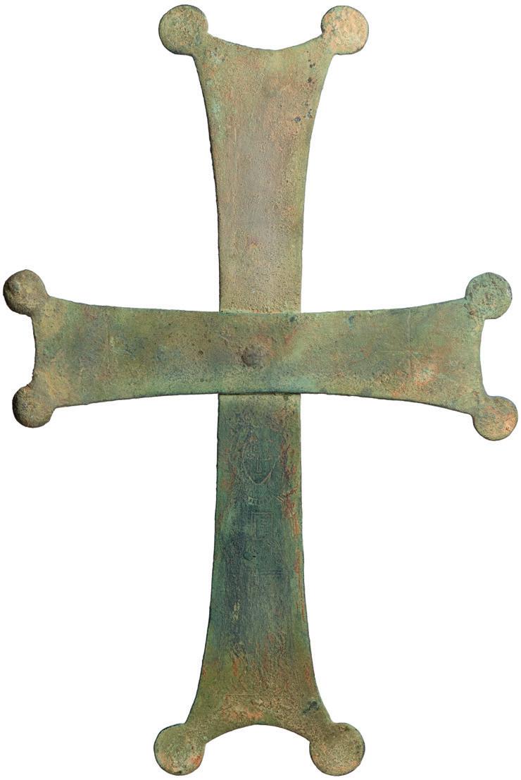 621. MEDIEVAL BYZANTINE LARGE BRONZE CROSS, ca. 9th-11th Century AD. Fashioned from two thin hammered sheets of bronze. This bronze Byzantine cross has flaring arms each terminating in pairs of discs. The cross could be carried in a processional and/or, as wear on the lower arm of the cross might indicate, affixed in a stand. L. 8 5/8” W. 5 5/8” (21.9 cm x 14.3 cm) 1850