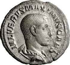 22. CARACALLA AS CAESAR; 195-198 AD, Rome, 195-6 AD, Denarius, 3.15g. BM-186 corr. Obv: M AVR ANTO - NINVS CAES Bare-headed, draped bust r., seen from front. Rx: SEVERI AV[G] - PII FIL on l. and r., Priestly implements: lituus, knife, tall pitcher, ladle, sprinkler. Ex Curtis L. Clay Collection. Bust seen from front is considerably scarcer on this denarius than bust seen from behind. BMC pp. 50-51 fails to point out that only one of the museum’s five specimens of this denarius, no. 186, shows the scarcer “seen from front” portrait. EF 485 Unpublished