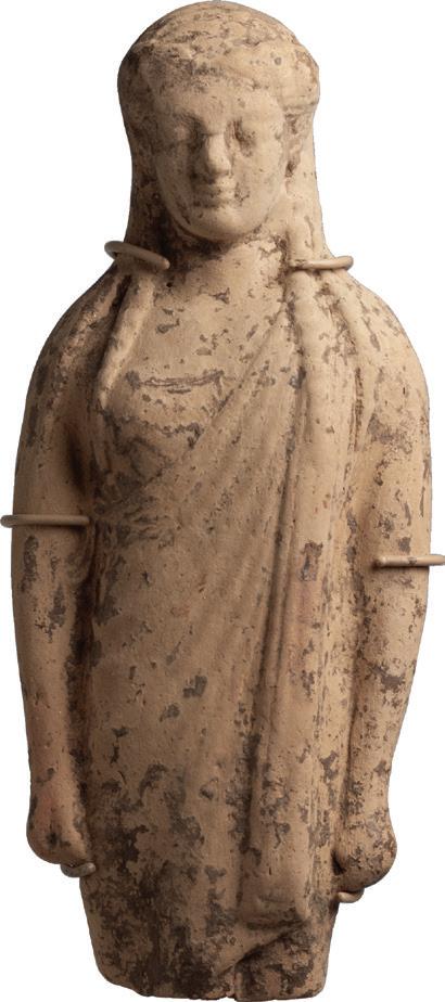 588. GREEK TERRACOTTA VOTIVE KORE, ca. 6th Century BC. Standing draped female figure with long beaded hair. Her arms are held closely to her sides, himation drapes across her body from the left shoulder.