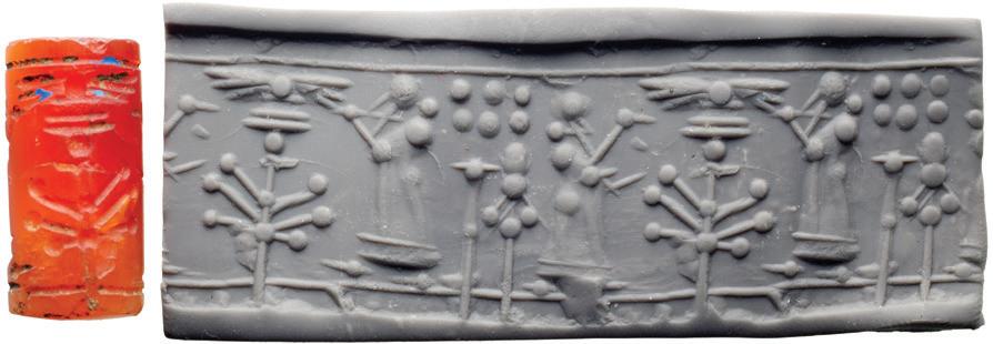 950 626. ROMAN CARNELIAN INTAGLIO, ca. 1st-3rd Century AD. Two facing figures, one seated with frond behind. L. 5/8” W. 1/2” (1.6 cm x 1.3 cm)