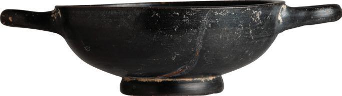 609. ATTIC BLACK GLAZE STEMLESS KYLIX, ca. 5th Century BC. The double handled vessel featuring a broad bowl with curved walls, sitting upon a tiered foot.