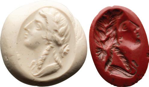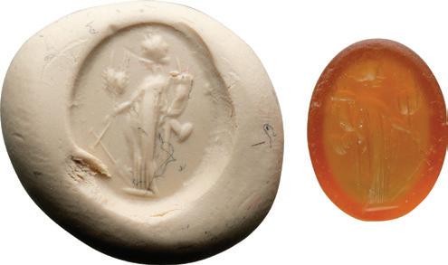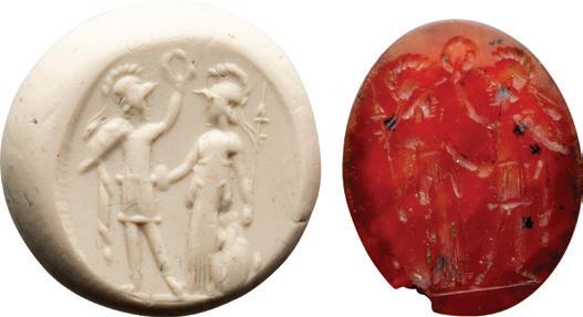 631. ROMAN CARNELIAN INTAGLIO, ca. 1st-3rd Century AD. Winged Victory facing Athena. Small chip to edge. L. 11/16” W. 1/2” (1.7 cm x 1.3 cm)