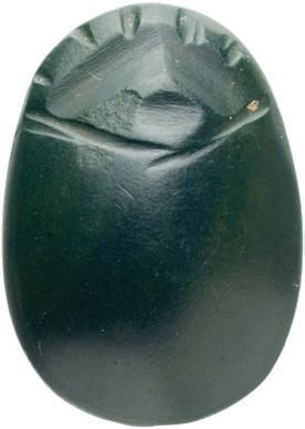 585. EGYPTIAN FAIENCE CUP WITH CARTOUCHE SETI 1, Late Period, ca. 700-30 BC. Blue-green glazed faience pottery conical cup having areas of tan color surface mottling. Black finely painted hieroglyphic register containing a royal cartouche Seti 1. A nice example. Provenance; Private New York City Egyptologist collection acquired from Arte Primitivo, lot 84. Ex CT collection, ex John Winnie Jr. collection, Georgia, 1980s-90s. H. 2” W. 2 1/4” (5 cm x 5.7 cm) 1950 586. EGYPTIAN DARK GREEN JASPER SCARAB, Late Period, ca. 664-332 BC. Ex Krysko Collection, MA, purchased European art market 1980s-1990s. L. 3/4” W. 1/2” (1.9 cm x 1.3 cm)