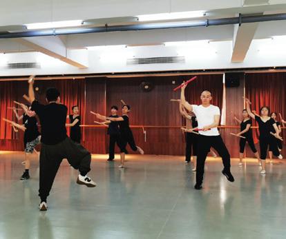 7.隨後我們來到汕頭藝術 學校,拜訪吳絢婷老 師,她出版了《潮汕英歌舞 研究》專著,並安排了女 學 生們展示英歌基本陣式和造 型。學院派的英歌屬於中快 板,其中時遷玩弄帶路蛇, 要蹲低用 腳尖和小腿力量輕 跑,應是取材於舞臺戲曲的 丑角形態。我們在校參加了 練習。