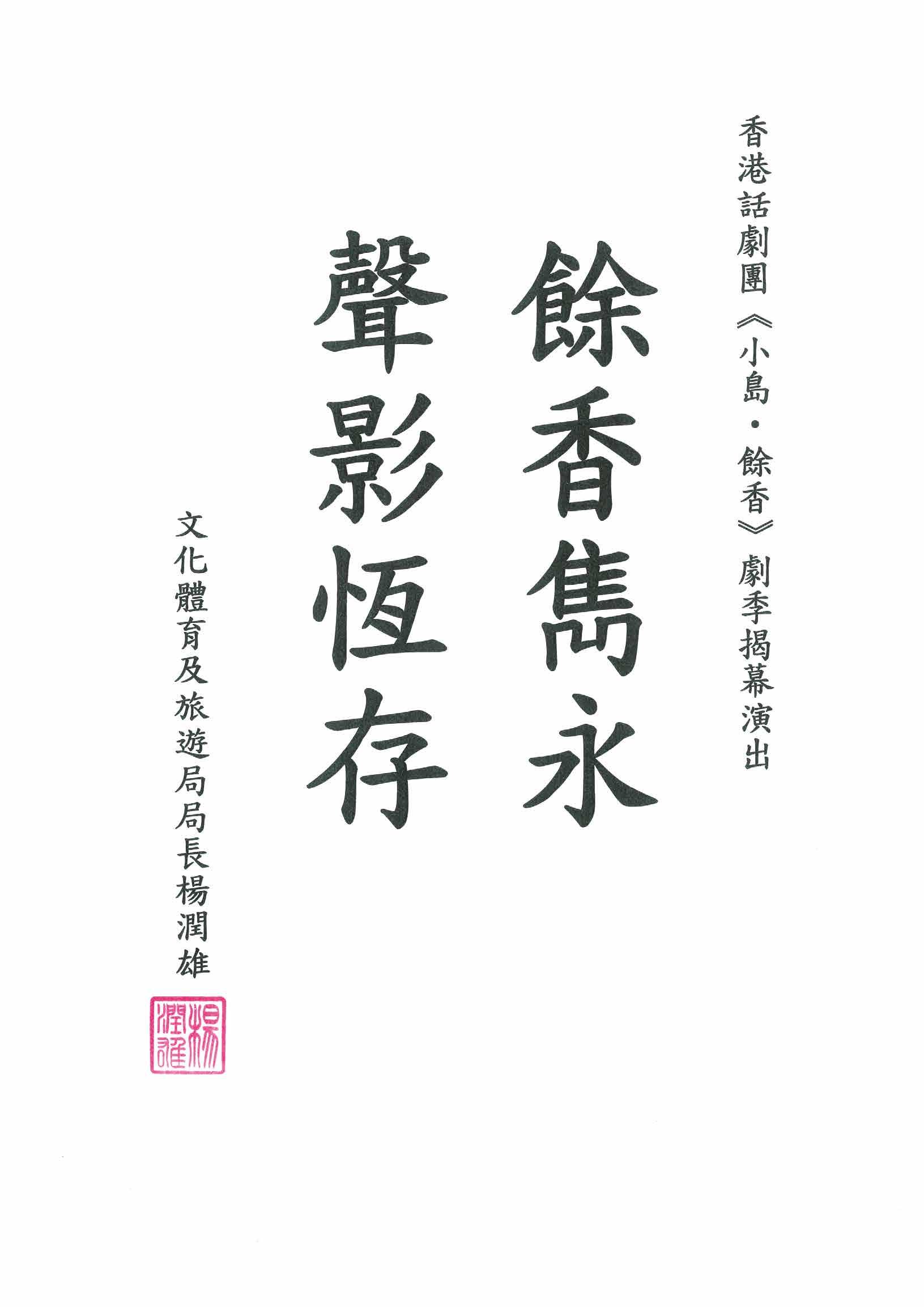 最後,希望大家享受今次《小島.餘香》的演出,再一次多謝各位的蒞 臨,見證話劇團新時代的起步!祝大家身體健康、生活愉快!