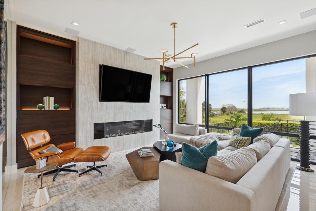 Two huge islands, custom European cabinets, Thermador and Miele appliances fit for a professional chef, quartz countertops, a 750-bottle wine wall, and floor to ceiling windows are some of the many notable features in these expertly designed spaces. Off the kitchen is the wonderful living room adorned with a gas fireplace and impressive views all around.