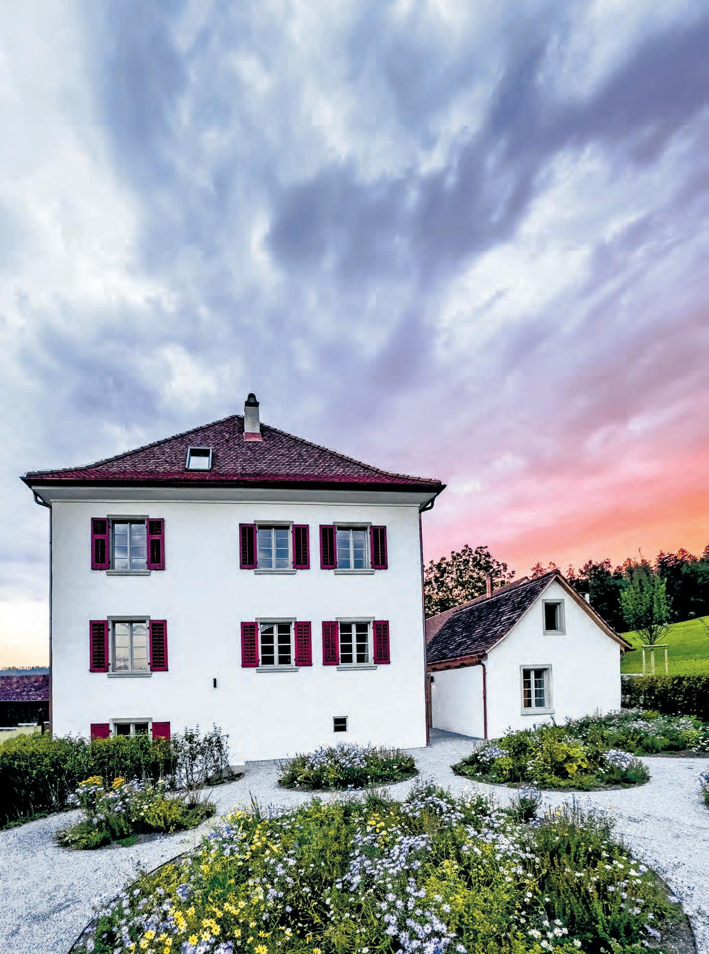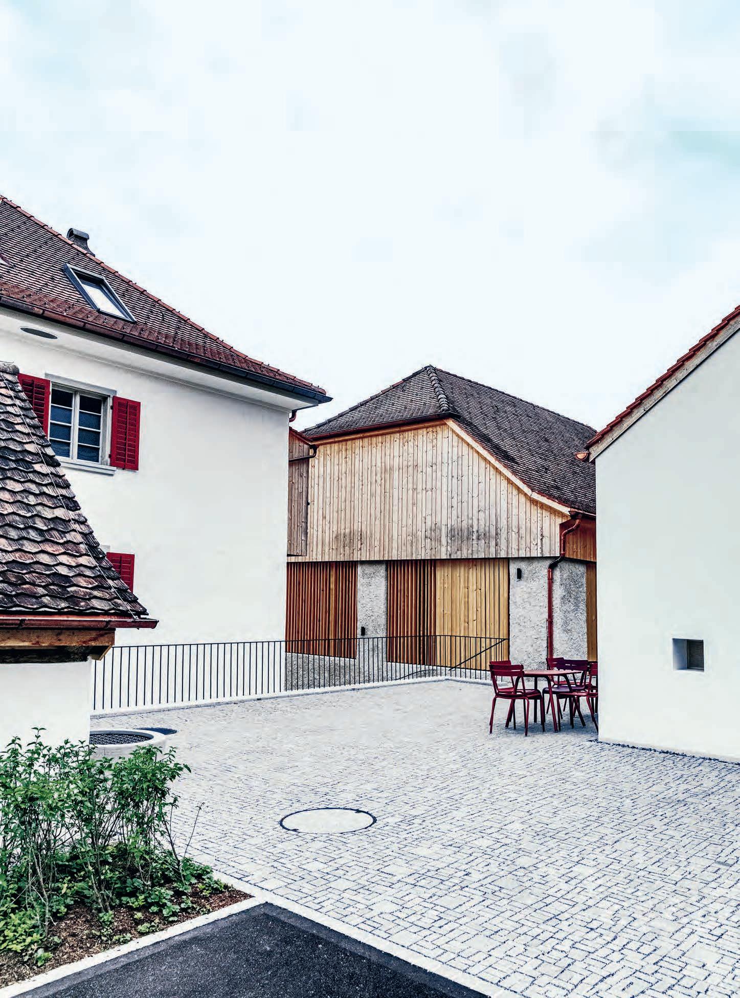 Umso erstaunlicher ist die Wandlung, die das Ensemble innert kurzer Zeit erfahren hat. Was noch vor wenigen Jahren desolat und heruntergekommen wirkte, erstrahlt seit Sommer 2024 im sprichwörtlichen neuen Glanz: Das klassizistische Wohnhaus ist frisch verputzt, Fensterläden und Türen ausgebessert und gestrichen, bei der Scheune weisen neue Holzlamellen und moderne Verglasungen auf eine veränderte Nutzung hin. Zwischen den beiden Bauten an der Strasse führt eine breite Aussentreppe hoch zu einem neuen Hofgebäude, das einen geschützten Platz fasst und sich selbst vornehm zurücknimmt. Daneben –ebenfalls frisch saniert – entdeckt man das ehemalige Waschhaus. All dies ist eingebettet in eine gepflegte Landschaft aus Gärten, Wiesen und Wegen. Aus zerfallenden