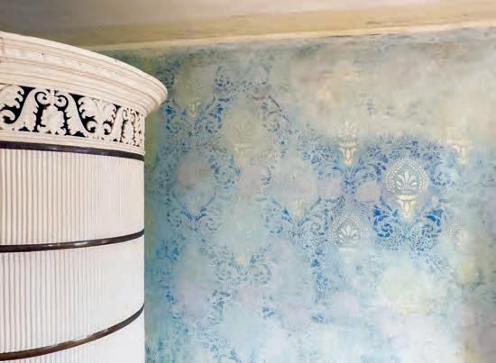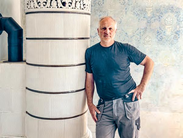 Es braucht Erfahrung, um abwägen zu können, ob eine Unebenheit als Fehler oder willkommene Struktur wahrgenommen wird. Für die Badezimmer haben wir dem Sumpfkalk Marmormehl beigemischt. Dieser sogenannte Marmorino wurde früher für ornamental gestaltete Arbeiten verwendet. Dass eine noble Technik im Badzimmer zum Zug kommt, finde ich richtig, verbringt doch der Mensch heutzutage hier viel Zeit. Die krontaubenblau eingefärbte Marmorino-Oberfläche haben wir am Schluss mit Olivenseife und Carnaubawachs behandelt, sodass das Wasser schön abperlt. Im Konzertsaal haben wir unzählige Proben gemacht, um herauszufinden, ob ein Lehm- oder Kalkputz das akustisch bessere Resultat gibt. Weil beides zum gleichen Resultat führte, haben wir uns – im Dienst der Harmonie – für den Kalkputz entschieden. » Lukas Beck, Gebrüder Beck Stuck – Putz – Trockenbau