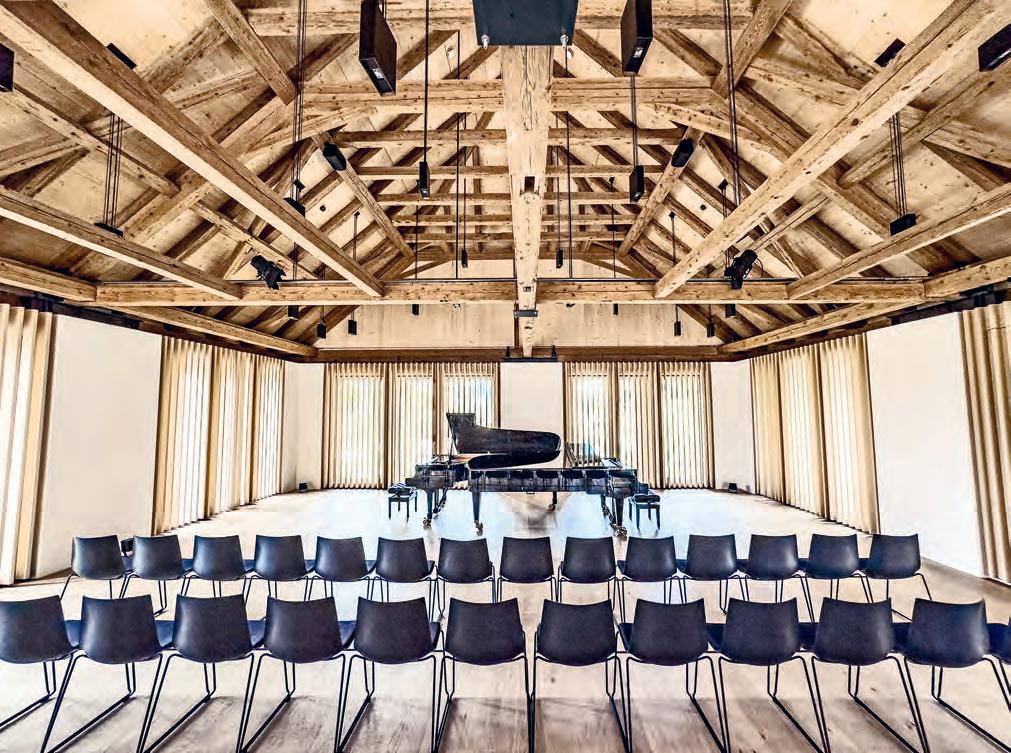 Der Konzertsaal in der ehemaligen Scheune besitzt einen eindrucksvollen Dachstuhl.