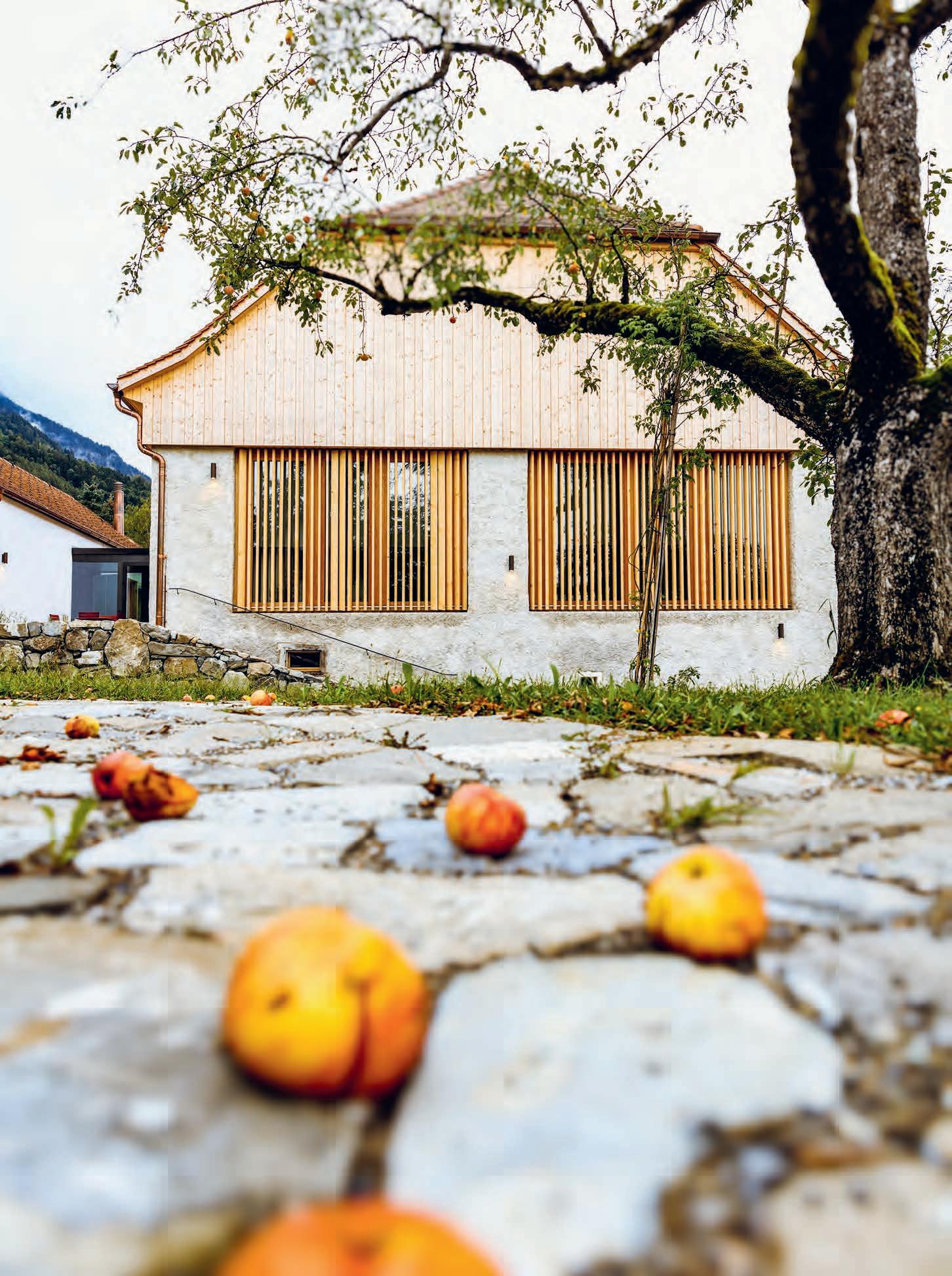 Ein paar Obstbäume haben wir neu gepflanzt, um das Ensemble mit der Landschaft zu verzahnen. Drei alte Bäume wollten wir unbedingt erhalten: einen stattlichen Nussbaum, einen alten Apfelbaum und einen Birnbaum, der schon ziemlich versehrt ist.