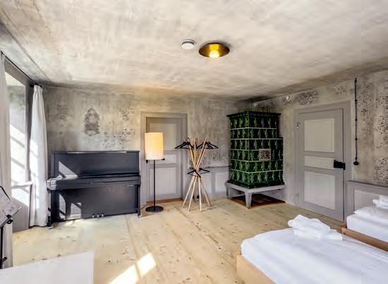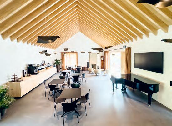 Das Untergeschoss des Neubaus bietet den notwendigen Raum für Sanitär- und Technikanlagen sowie für den Regieraum, der für Film- und Tonaufzeichnungen benutzt wird und über Video mit dem Konzertsaal verbunden ist. Diese Auslagerung von sekundären Nutzungen ermöglicht es, die Stallscheune freizuspielen und exklusiv als Konzertsaal zu nutzen. Die neue Nutzung ist hier zwar eine grundlegend andere als früher, dafür kommt der Raum umso wirkungsvoller zur Geltung. In der Scheune mit ihrer beeindruckenden Dachkonstruktion und dem stimmungsvollen Lichteinfall gibt es nicht viel mehr als Menschen und Musik, Stühle und Instrumente. Ähnlich wie beim Wohnhaus passten die Dimensionen des Bestands auf fast schon wundersame Weise mit den Vorstellungen der Musikakademie zusammen. Die zum Konzertsaal umfunktionierte Scheune bietet Platz für 120 Personen sowie optimale Raumverhältnisse für Solound Kammermusikkonzerte. Gleichwohl waren hier die Eingriffe stärker als im Wohnhaus, was vornehmlich auf die nötigen akustischen und visuellen Anforderungen eines Konzertsaals zurückzuführen ist. So entfernten die Architekten in Abstimmung mit dem Denkmalschutz die mitten im Raum stehenden Holzstützen und verstärkten den Dachstuhl stattdessen mit stählernen Zugbändern. Noch herausfordernder war die Lage der Scheune an der Hauptstrasse. Die Planenden integrierten SchallschutzKastenfenster in den grossen Öffnungen und isolierten die Mauerpfeiler. Die grossformatigen Kastenfenster verstecken sich zwischen den innen und aussen angebrachten beweglichen Holzlamellen, die wiederum an die historischen Holzverschalungen der ehemaligen Stallscheune und das gefilterte Licht in alten Ställen erinnern. Auch die Statik ( man denke an zwei Konzertflügel und ein hundertköpfiges Publikum ) for derte ihren Tribut: So wurde der Holzboden durch eine neue Stahlbetondecke ersetzt, die gleichzeitig die bestehenden steinernen Pfeiler stabilisiert. Was aussen nach wie vor wie eine Scheune aussieht, entpuppt sich so im Innern als moderner Musiksaal mit historischem Cachet, spannungsvoll situiert zwischen Komfortansprüchen und Denkmalerhalt.