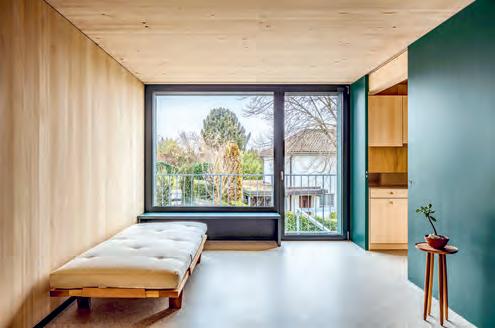 der unteren beiden Geschosse liegen zum Teil im Hang, die kompakten Wohnungen der Obergeschosse öffnen sich zu beiden Seiten in private Aussenräume. Ein gemeinsam genutzter Raum fördert die Gemeinschaft der Siedlung, ein Mobilitätskonzept reduziert zusammen mit der Holzbauweise ihre Treibhausgasemissionen. Die Siedlung Waldacker ist schweizweit der erste mit SNBS-Platin zertifizierte Holzbau. Fotos: René Dürr