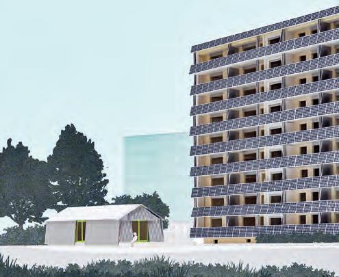 Roger Boltshauser: Dans le projet de c oncours, l’installation solaire était encore placée à la verticale sur la façade. Pour la suite, nous avons d’abord pensé à des brise-soleils, qui devaient faire de l’ombre aux fenêtres, mais pas aux modules photovoltaïques dans la zone des allèges. Puis, nous avons eu l’idée d’utiliser les modules solaires euxmêmes comme des brise-soleils. Nous avons vu que nous pouvions loger ainsi deux fois et demie plus de modules et couvrir les besoins en électricité d’une bonne moitié des appartements. Le bâtiment sera particulier: un socle de terre crue archaïque et une partie haute en ailes de papillon photovoltaïques. Comment alors réunir ces éléments ?