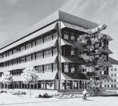 constantes d’un langage architectural qui fait explicitement référence aux architectes postmodernes américains mentionnés plus haut. Oliver Lütjens rapporte qu’il a d’emblée voulu obtenir une expression sculpturale qui s’affranchisse de la lourdeur et de la massivité. Évoquant les bâtiments de John Hejduk pour l’IBA Berlin, l’avanttoit emblématique qui surplombe la porte d’entrée de l’immeuble de Binningen ( 2014 ) indiquait la voie: des éléments en projection, de préférence à 45° et dans des couleurs marquantes, confèrent aux projets suivants de Lütjens Pad mana bhan une pré sence caractéristique. Les bandeaux d’allège, les garde-corps des balcons et les toits ne s’insèrent pas à la verticale dans la façade, mais sont dépliés, comme s’ils attendaient le soleil depuis toujours.
