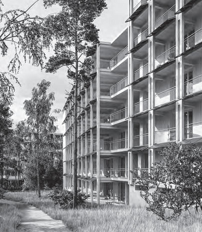 Dans le quartier d’Hirzenbach à Zurich Schwamen dingen, la c oopérative d’habitation Eigengrund possède une barre d’immeuble de neuf niveaux datant des années 1970 et comptant 81 appartements. En 2020, le bureau Lütjens Padmanabhan a remporté le concours de projets pour l’extension de cet immeuble avec des balcons et un pavillon de jardin à usage communautaire. La nouvelle rangée de balcons de 2,5 m de profondeur était à l’origine conçue comme une structure ouverte en acier galvanisé, équipée de garde corps grillagés déployés en écailles. Durant la planification, la maîtrise d’ouvrage a émis le souhait d’utiliser les balcons pour la production d’énergie solaire. Alors que les garde corps latéraux avaient été réalisés en grillage, les architectes ont, avec les concepteurs techniques, créé un module photovoltaïque s’étirant sur toute la longueur du bâtiment pour les bandeaux d’allège frontaux. Les modules sont en verre mat translucide avec une trame sousjacente de cellules solaires carrées et foncées. La structure en grille prévue à l’origine ne sert plus que de support aux nouveaux modules et trouve son pendant dans leurs trames géométriques clairesobscures. Marcel Bächtiger