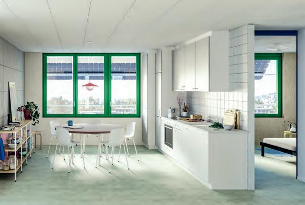 La façade tramée reflète le mode de construc tion modulaire par éléments préfabriqués. Sur le pourtour de chaque étage, les avanttoits en modules photovoltaïques et un bardage de métal rouge font osciller la façade entre légèreté dynamique et froideur technique. Dans le projet de concours de 2019, l’installation photovoltaïque était encore intégrée à la façade. En la dépliant vers l’extérieur, la surface utilisable pour la production d’électricité a plus que doublé. Les modules photovoltaïques en porte-à-faux dispensent par ailleurs de l’ombre à l’intérieur, protégeant ainsi les appartements de la chaleur estivale. Deborah Fehlmann