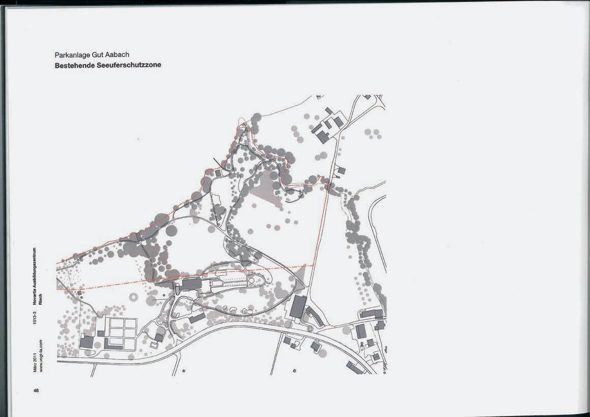 Gut Aabach ( Nr 12 , Seite 9 ) Ab 1928 s etzt der englische Industrielle Carl Langer mehrere Grundstücke zum neun Hektar grossen Gut zusammen. Villa, Gärtnerei und Landschaftspark entstehen ; über die Gestalter ist nichts bekannt. Ab 1950 gehört das Gut Bauunternehmer Ernst Göhner. 2001 erwirbt es eine Tochterfirma der Novartis für den Bau eines Ausbildungszentrums, entworfen von Peter Zumthor und Günther Vogt. 2014 lässt Novartis das Projekt aber fallen und beabsichtigt, das Gut zu verkaufen. Neue Pläne sind nicht bekannt. Eigentümer: privat Foto / Plan: Vogt Landschaftsarchitekten