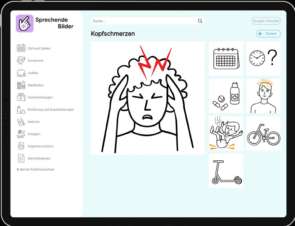 Berner Fachhochschule (Design, Pflege und Medizininformatik) hat den Prototyp einer digitalen Kommunikationshilfe für anderssprachige Kinderpatient:innen, deren Angehörige und Pflegefachpersonen entwickelt. Diese unterstützt bildbasiert die Kommunikation in der Notfall-Anamnese. Die Kommunikationshilfe wurde mit