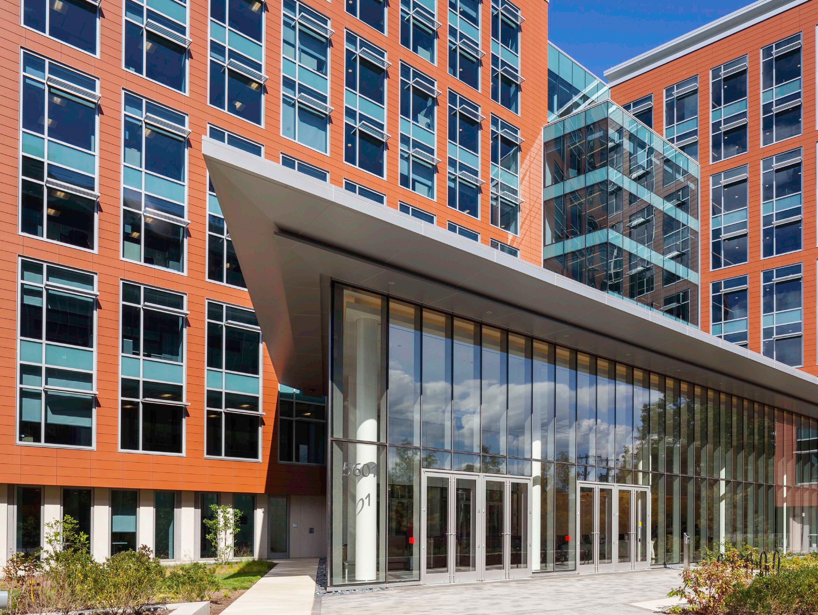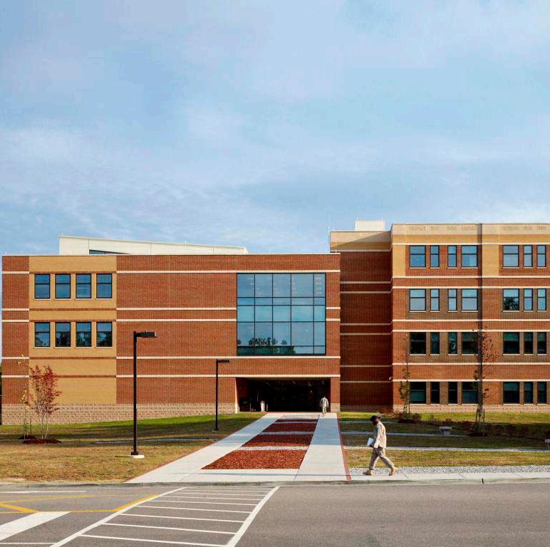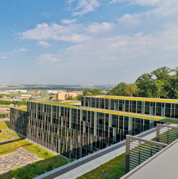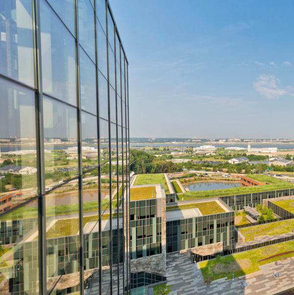 HOK’s design for the step-down courtyards, edges and green roofs provides continuity between the surrounding woodlands and an adjacent historic government campus. Rainwater that falls onto the green roofs permeates through the plant roots and soil and into a drainage system that leads to a stormwater pond for reuse in irrigation. Large amounts of soil were removed from this previously contaminated site and replaced with custom soil blends.