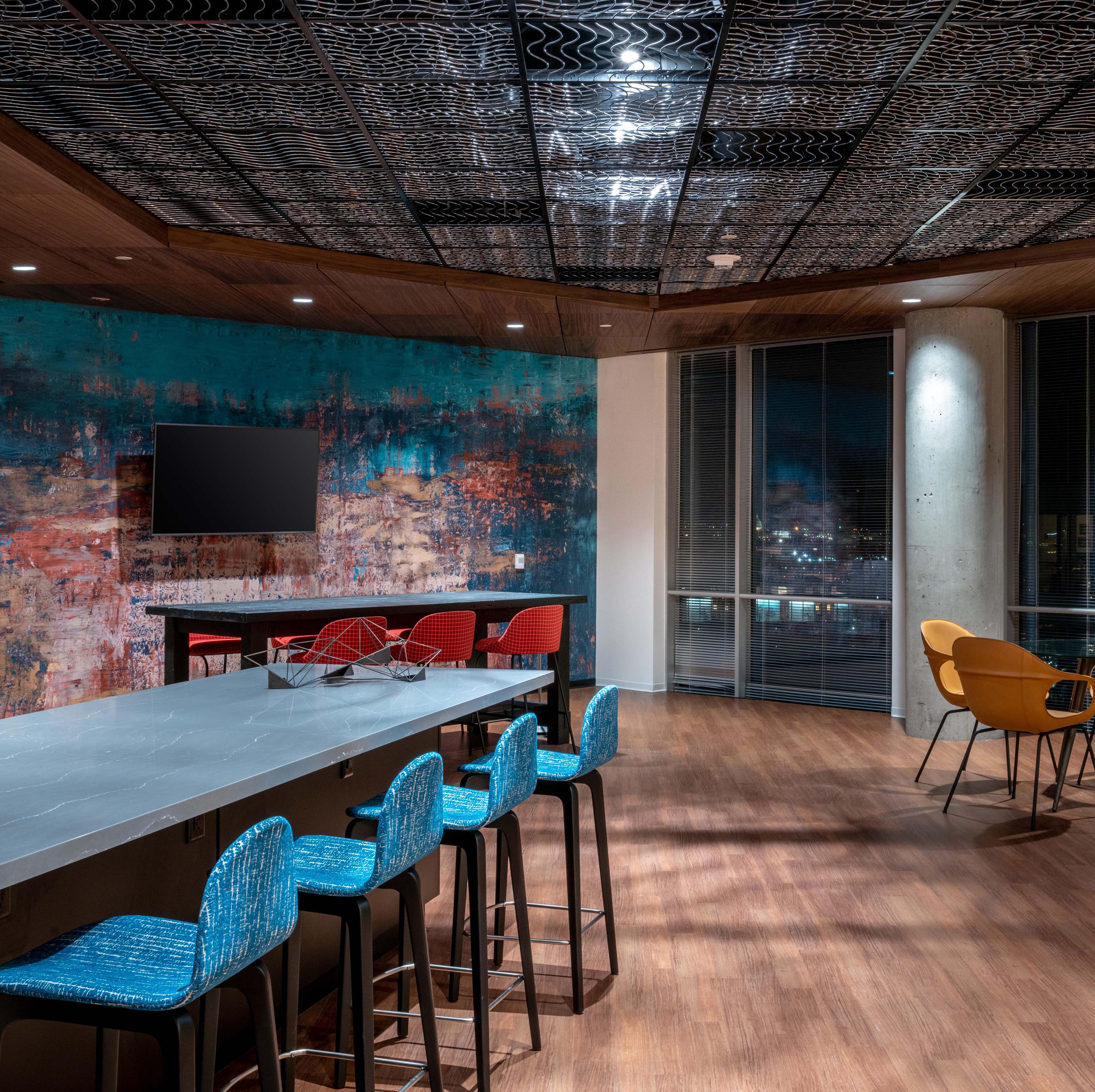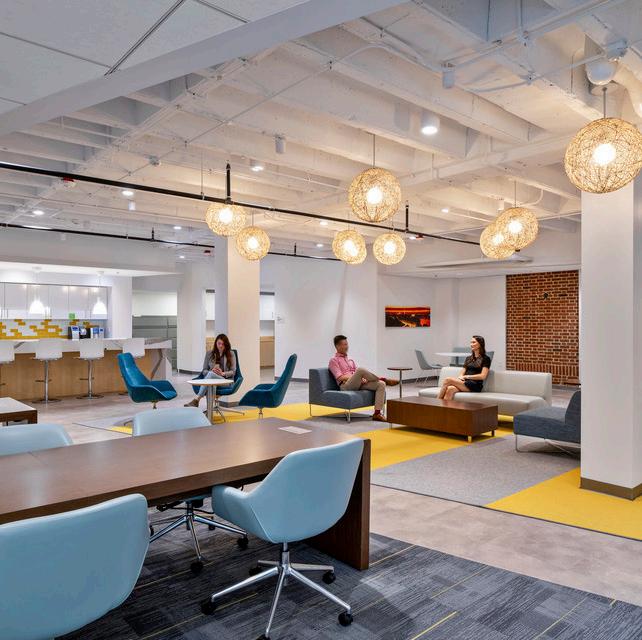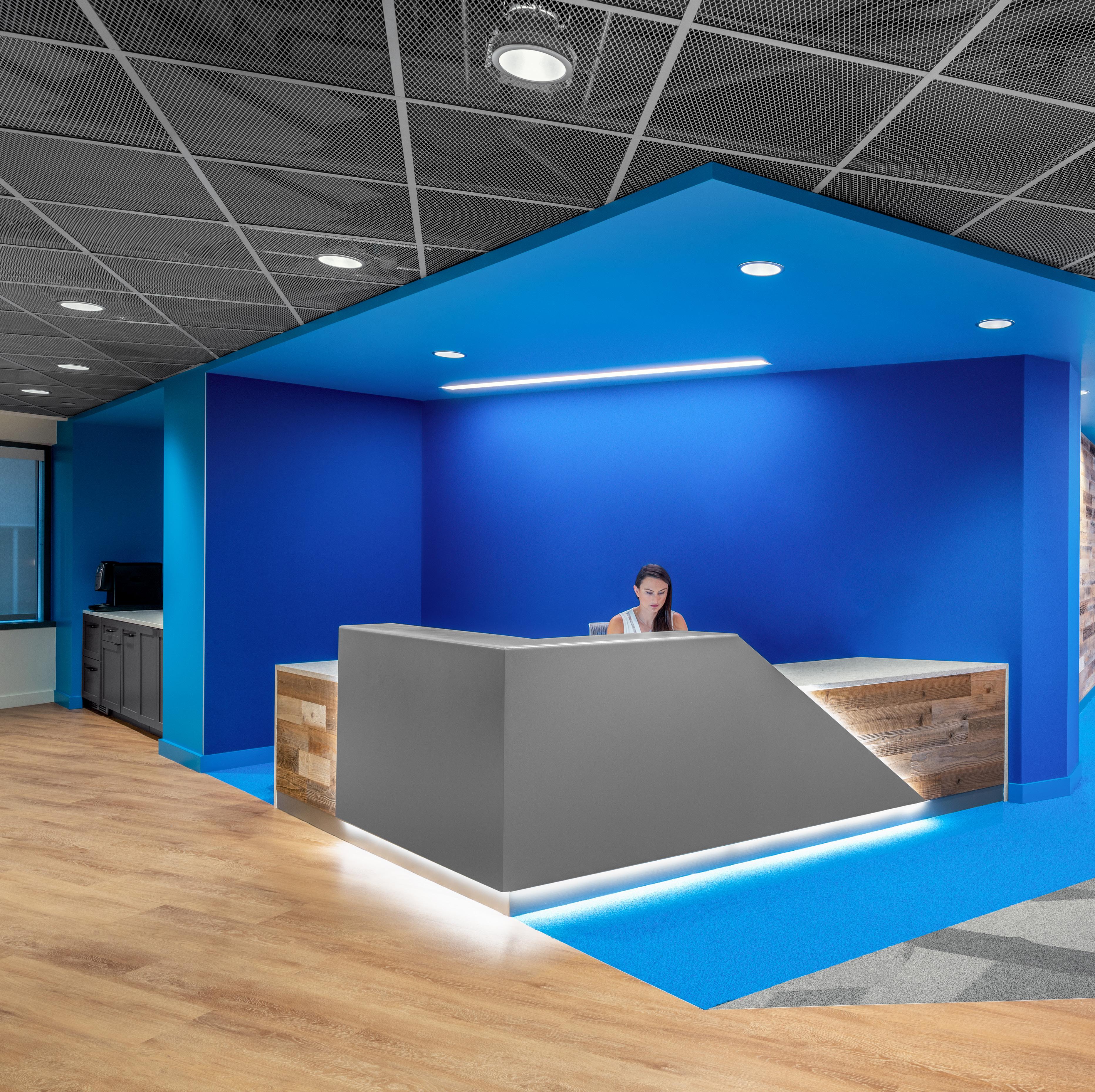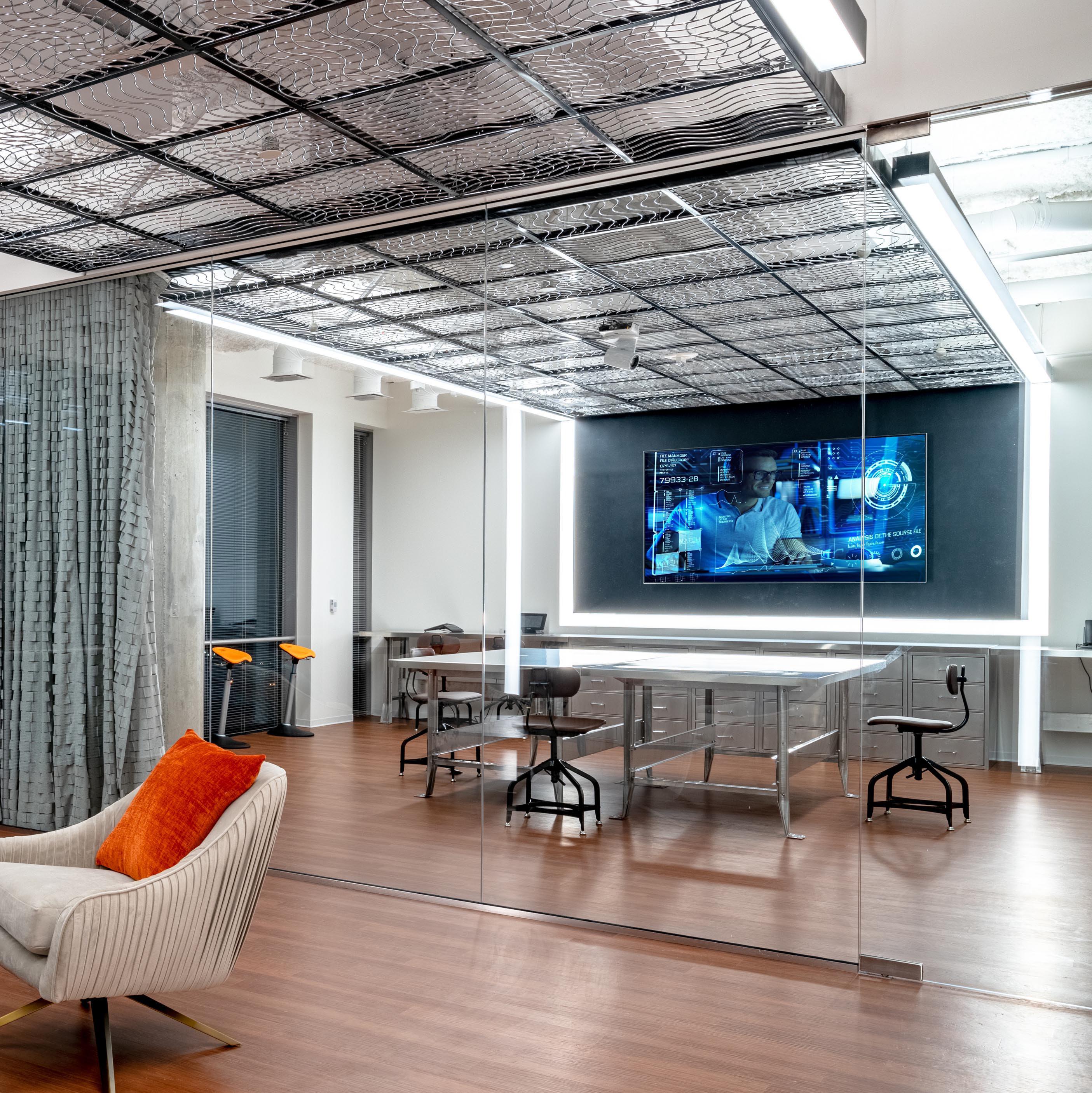 In the digital age, cyber is everywhere. As the world becomes smaller and more connected, cyber risk now permeates every aspect of how we live and work. Termed the Cybersphere, this brand new workplace is designed to explore the most pressing cyber challenges, by creating and testing the security of tomorrow’s Internet, and for gathering to learn, share, and define a path forward for organizations, employees, customers, and beyond. Featuring a variety of multipurpose spaces, the design liberates the corners of the entire floor to enable a mix of unique functions with a tech look-and-feel. Stepping right of the elevator, a digital representation of the iconic National Portrait Gallery Kogod Courtyard ceiling is projected onto the ceiling reinforcing the downtown DC setting and offering a theatrical nod to the digital era.
