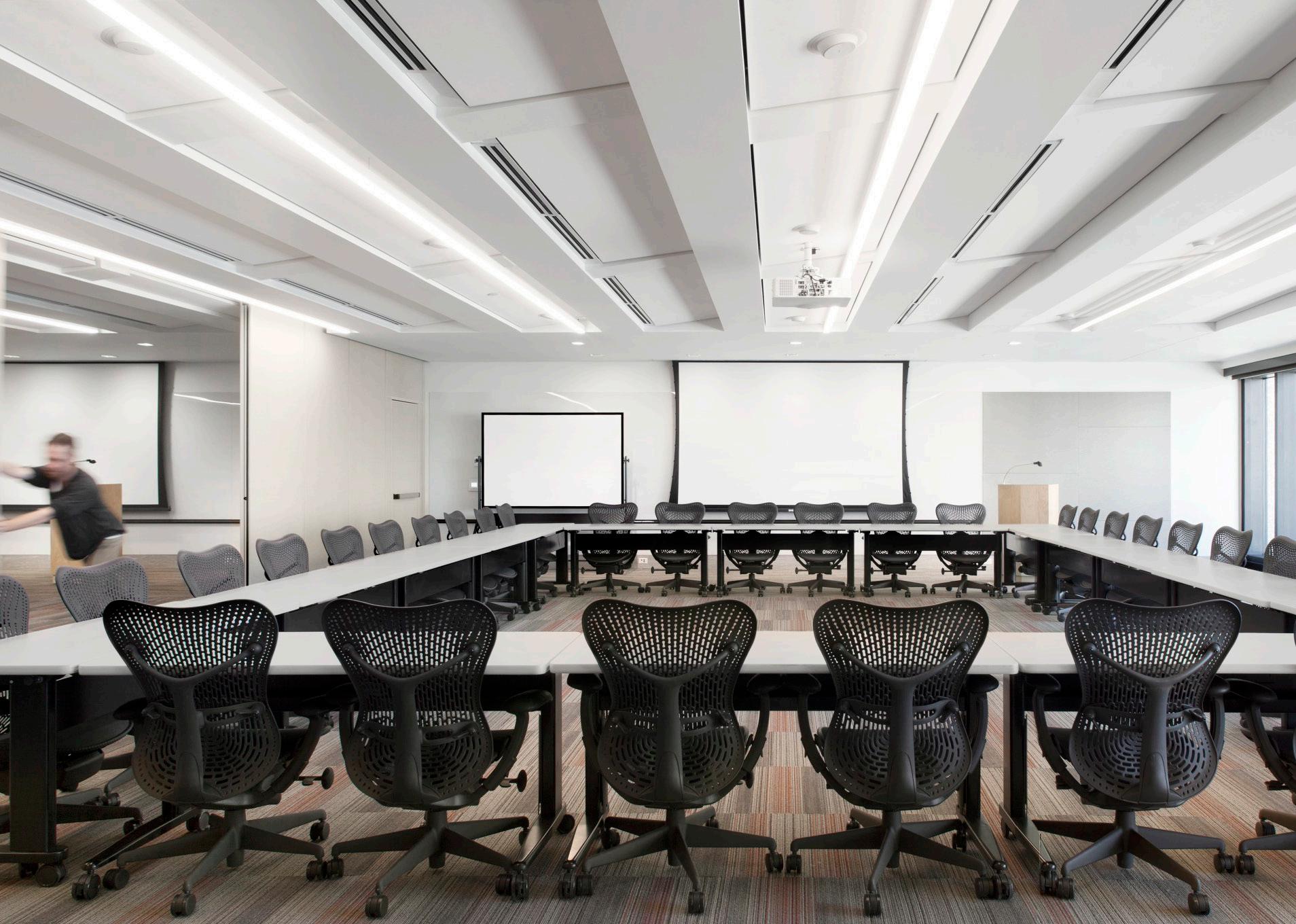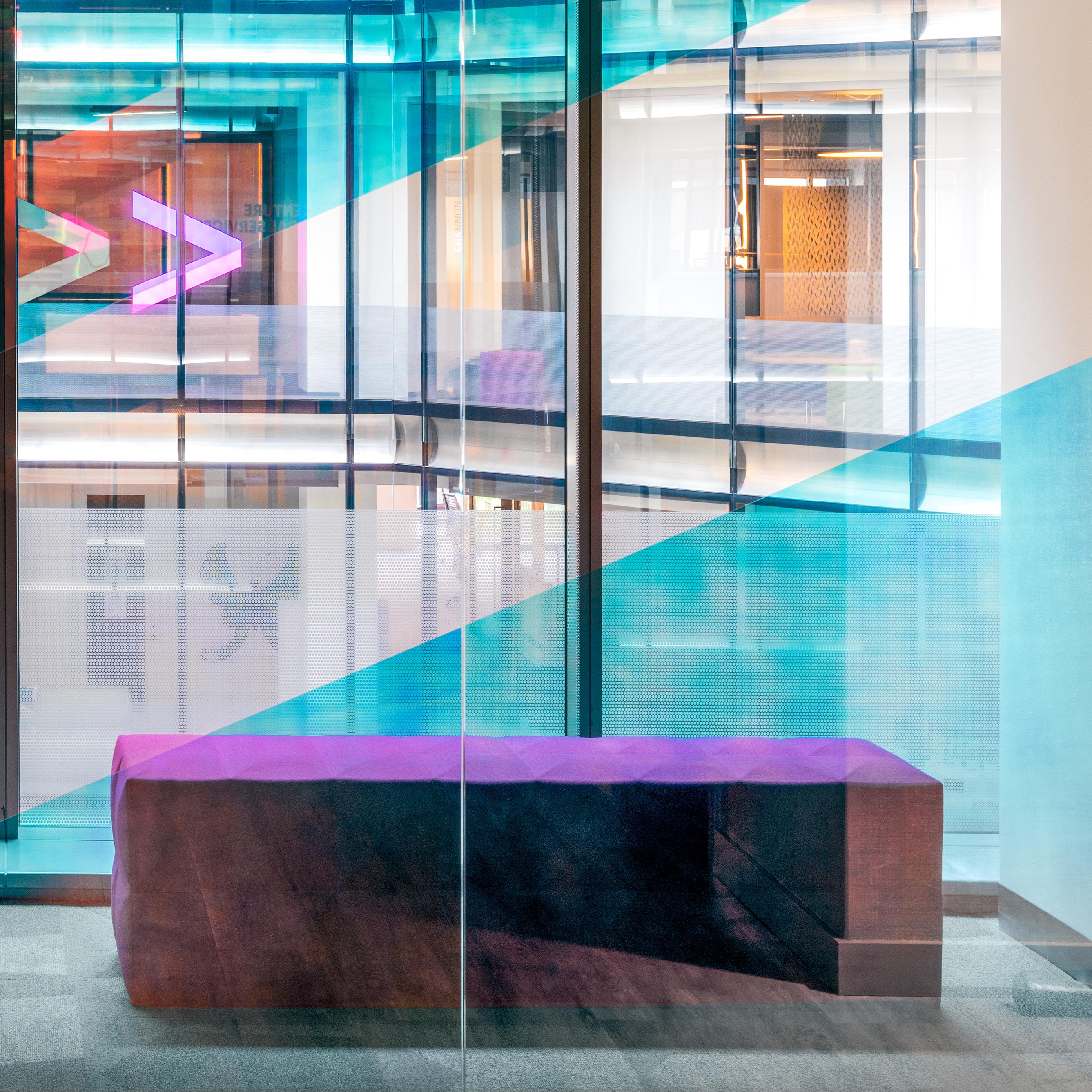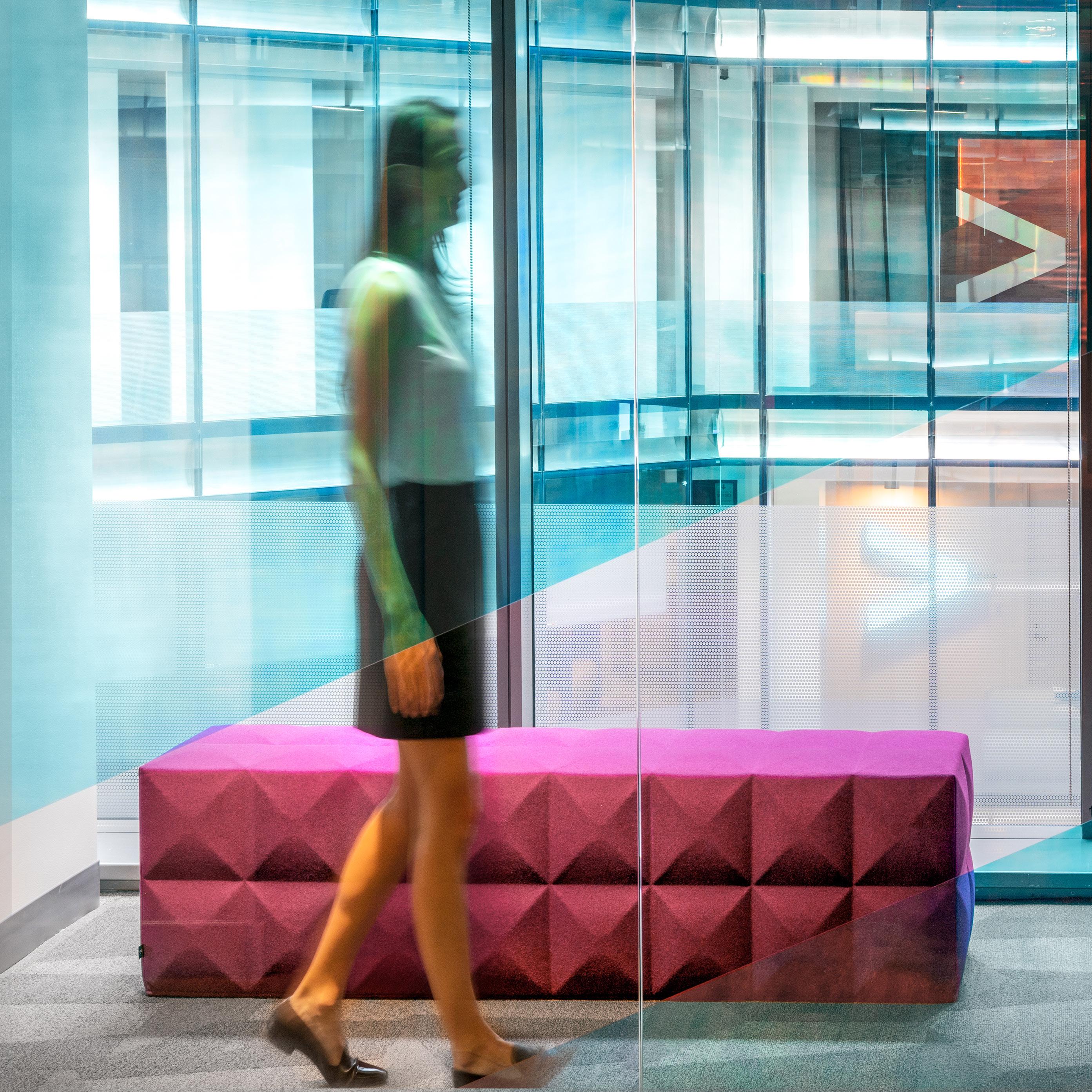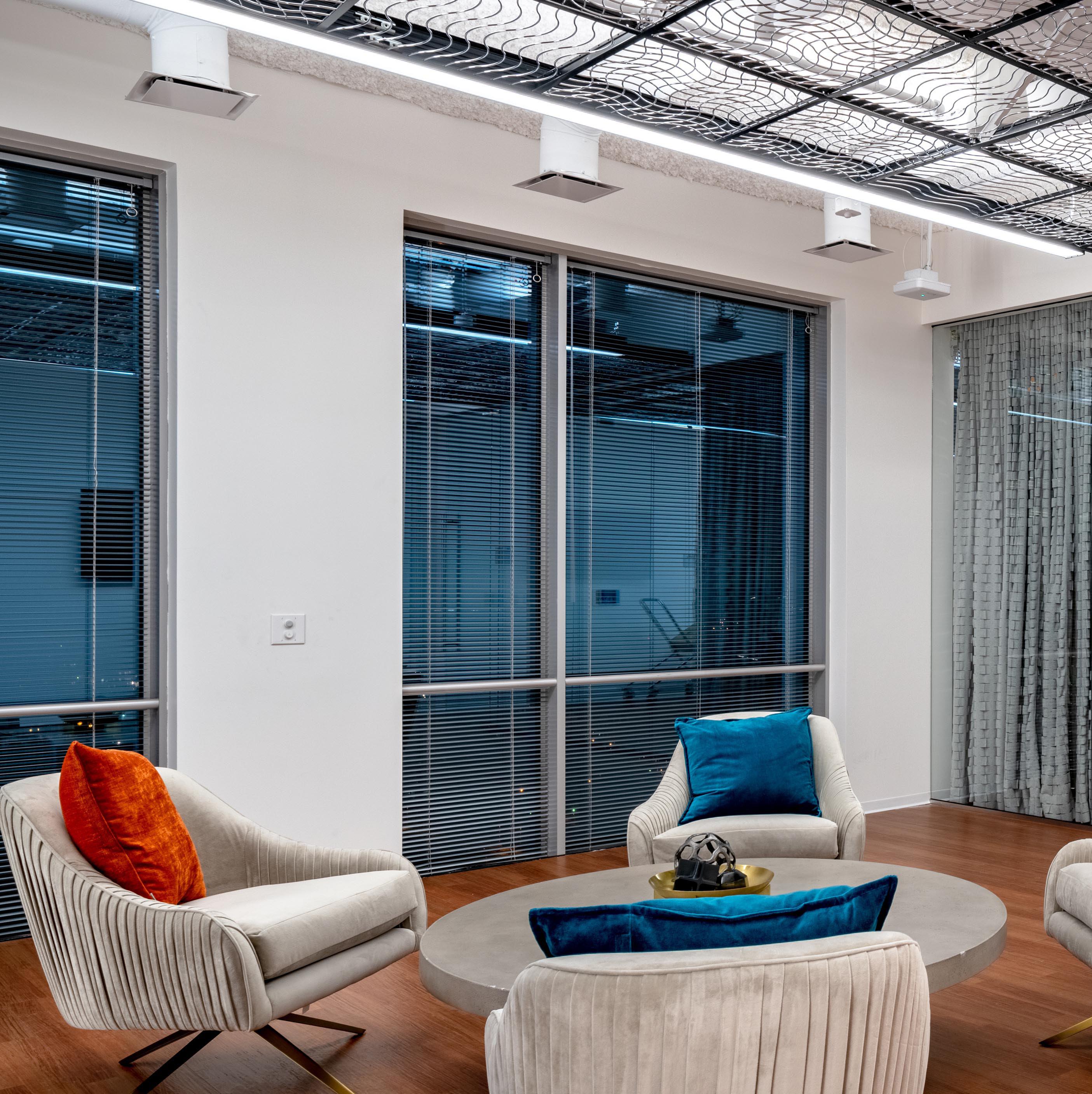 In the digital age, cyber is everywhere. As the world becomes smaller and more connected, cyber risk now permeates every aspect of how we live and work. Termed the Cybersphere, this brand new workplace is designed to explore the most pressing cyber challenges, by creating and testing the security of tomorrow’s Internet, and for gathering to learn, share, and define a path forward for organizations, employees, customers, and beyond. Featuring a variety of multipurpose spaces, the design liberates the corners of the entire floor to enable a mix of unique functions with a tech look-and-feel. Stepping right of the elevator, a digital representation of the iconic National Portrait Gallery Kogod Courtyard ceiling is projected onto the ceiling reinforcing the downtown DC setting and offering a theatrical nod to the digital era.